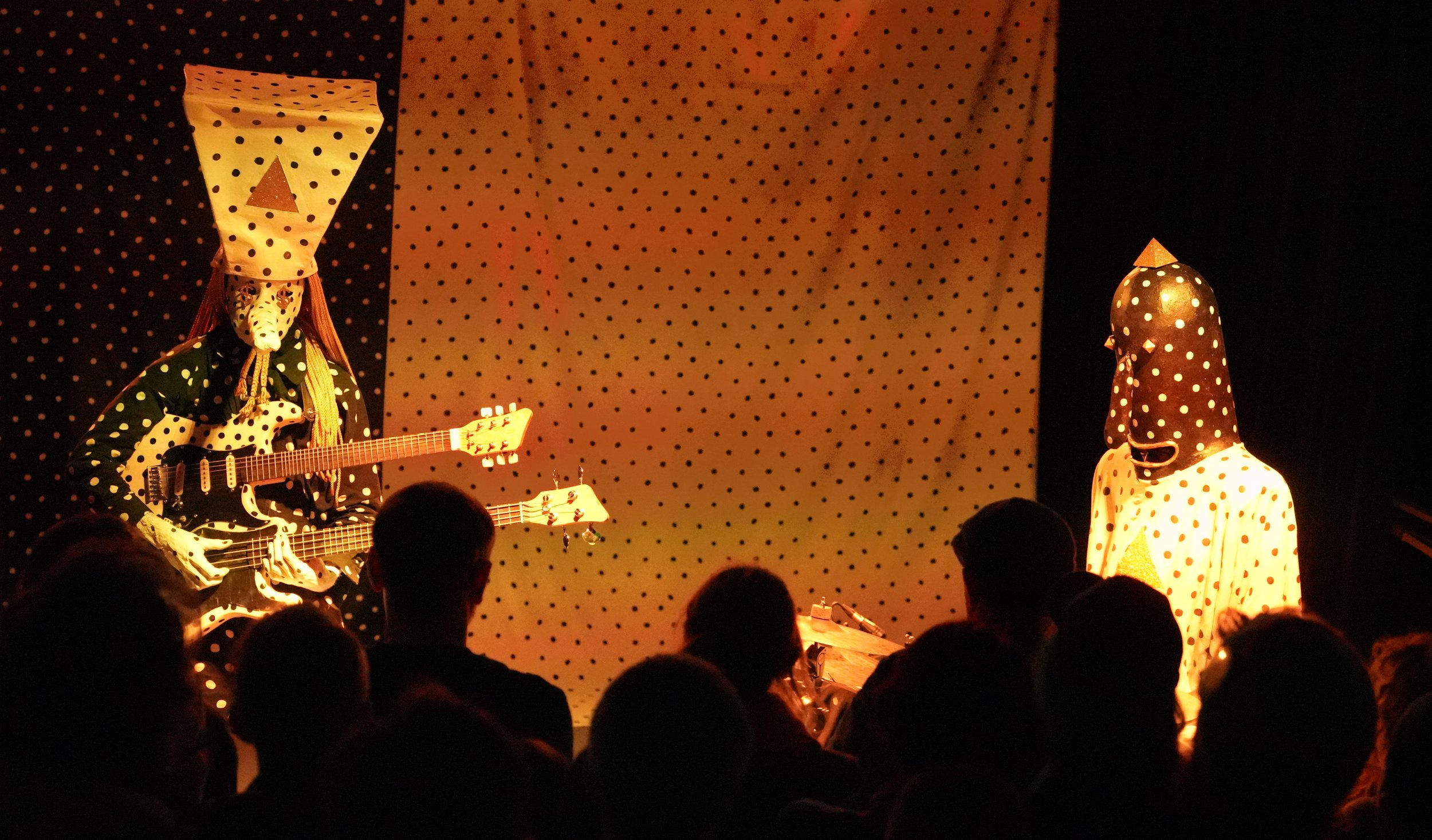 Khn, who sports the long-nosed, trapezoid hat, braided hair, polka dot papier-mache ensemble, serves as the duo’s guitarist and bassist, using a double-neck guitar-bass contraption. Klek, whose appearance consists of a long, tall black papier-mache mask, a proboscis monkey-like noise and ominous eyes that peak out at the bottom of the mask, is the duo’s drummer. Both contribute rare, cryptic vocals to their music.