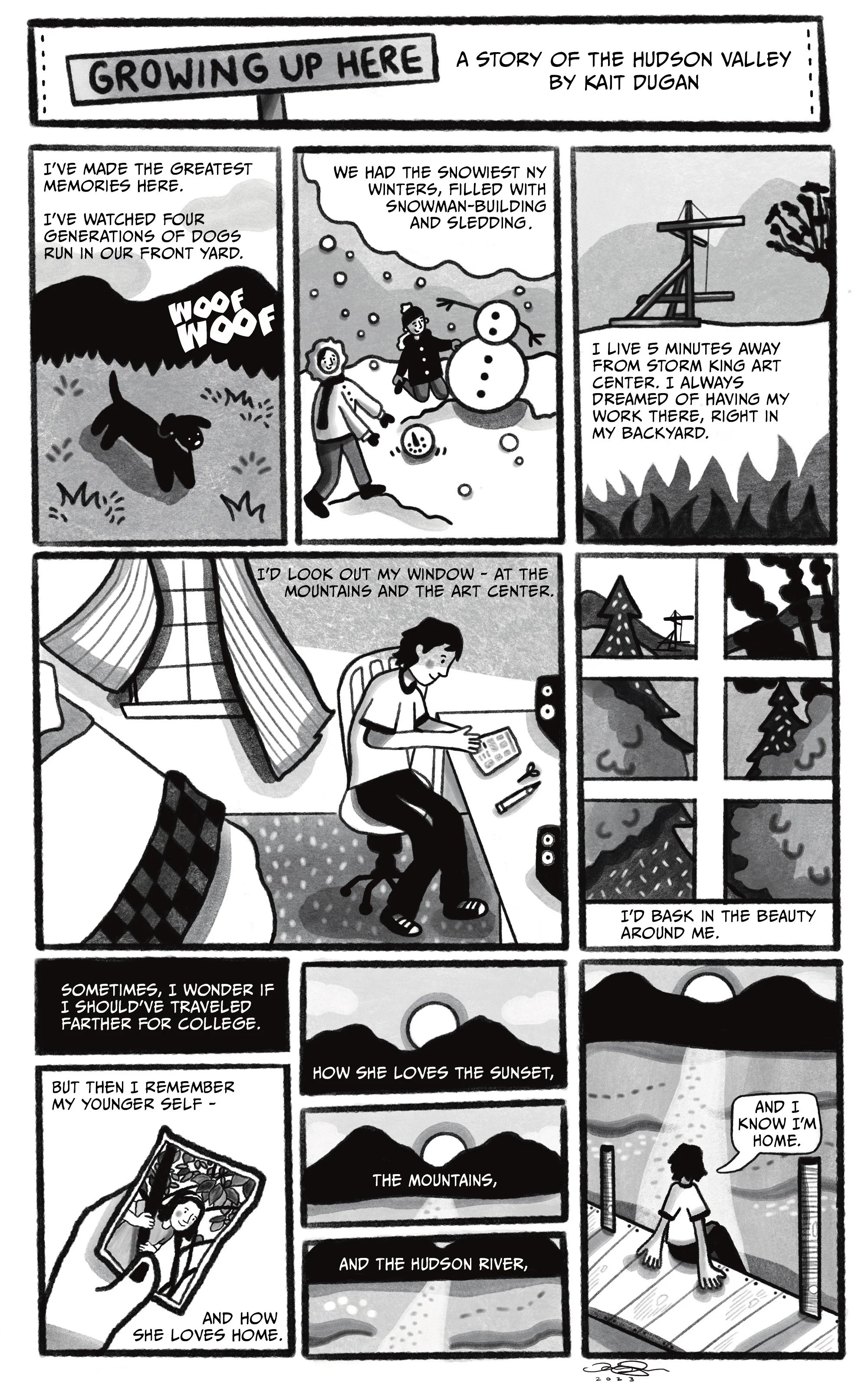 A comic on the Hudson Valley drawn by Kait Dugan '25 that is reproduced inside Moira Fitzgibbons' new book Drawn by the River: The Hudson River Valley as a Comics Ecosystem. Photo courtesy of Moira Fitzgibbons